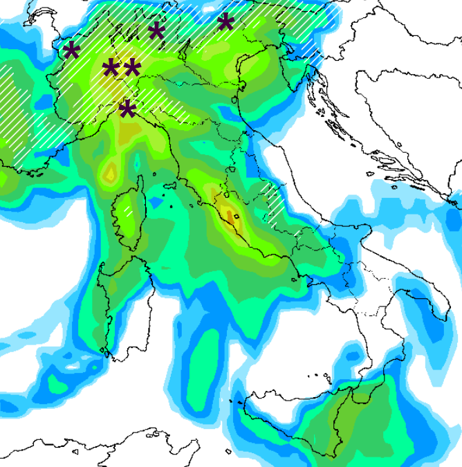 Qui sopra si nota la neve cadere addirittura vicina alla costa ligure tra Savonese e Genovesato, nel Pavese e nel Milanese, Vercellese, Alessandrino e su diverse altre aree poste oltre i 300m sull’arco alpino, ma si tratta solo di una prima proiezione, che è però già un segnale di un ritorno a condizioni più spiccatamente invernale.