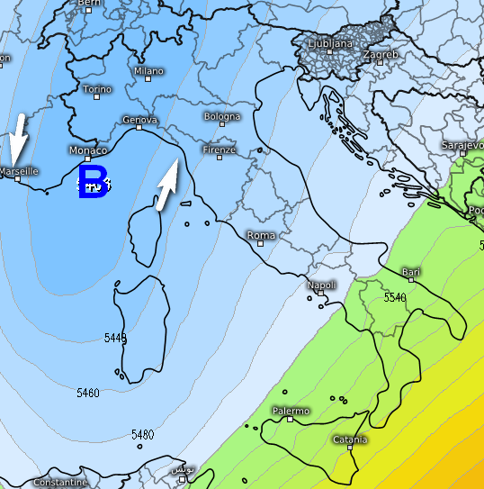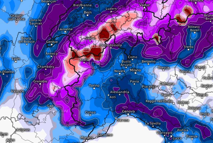 I quantitativi di neve che invece vedete accumulati sull’arco alpino sono invece il risultato di sommatoria di nevicate previste nei giorni precedenti, perché in questa occasione il minimo di pressione basso, cioè sul Mar Ligure, non dovrebbe consentire la risalita delle nevicate sin sul settore alpino.