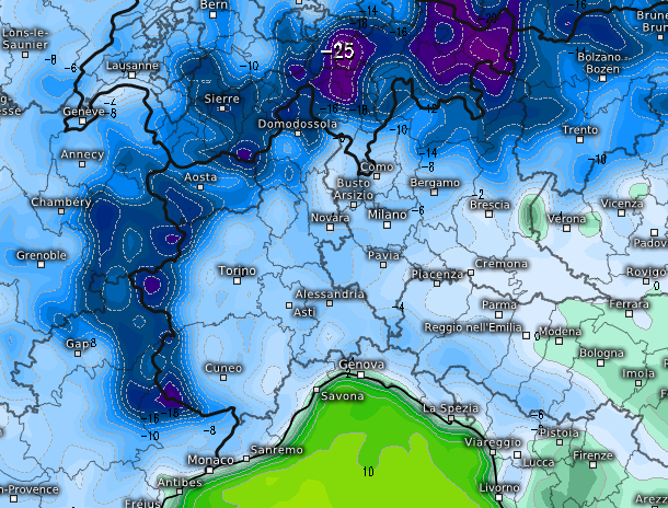 5-10cm tra il basso Piemonte e l’ovest Lombardia, Milano, Pavia, Alessandria, Asti, Novara comprese, una spruzzata sul Piemonte occidentale, così come sul Piacentino, accumuli più consistenti sull’Appennino ligure e qualche fiocco non escluso anche sulle coste tra Savona e Genova grazie ad un potenziale intervento della Tramontana scura, mentre appare decisamente sovrastimata (perché “spalmata”) la quantità di neve tra La Spezia e Viareggio sulla costa, mentre sulle Apuane la neve potrebbe cadere generosa.