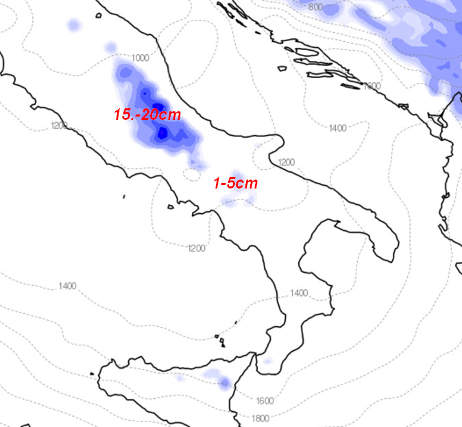 A quote di circa 1.000-1.300m sono attesi fino a 15-20cm sull’Appennino Abruzzese, 10 cm su quello Marchigiano e circa 5-10 cm sull’Appennino Molisano. Qualche debole nevicata interverrà anche sull’Appennino Dauno, ma solo oltre i 1.000-1.100 metri. Non si tratterà quindi di nevicate particolarmente abbondanti, tuttavia dobbiamo considerare che non è ancora iniziata la stagione invernale.