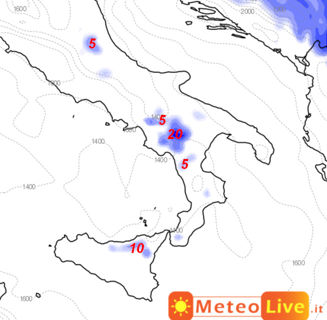 Ulteriori 5cm saranno possibili sull’Appennino Marchigiano, Abruzzese e Molisano sempre a quote intorno a 1.100-1.300m, anche se la neve cadrà più in basso con accumuli inferiori, come abbiamo indicato all’inizio dell’articolo. 20cm sono attesi anche sull’Appennino Lucano oltre i 900 metri e sui monti Nebrodi in Sicilia oltre i 1.300 metri, dove cadranno in media 10cm. 5cm sono attesi infine sulla Sila e l’Aspromonte attorno a 1100-1200 metri ma le nevicate dovrebbero cadere finbo a 1.000m entro la serata di sabato.
