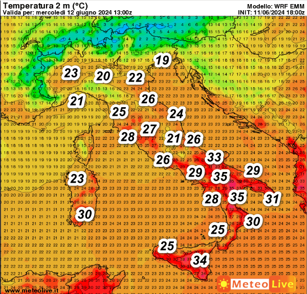Punte di 35° sulla Lucania e 34° in Sicilia. Valori sotto media su alcune aree del settentrione, anche sotto i 20° specie al nord-est.