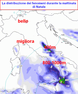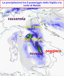Attesa qualche nevicata in Appennino, a quote anche basse in Adriatico. Natale ancora con piogge e nevicate al sud, ma con tendenza ad attenuazione dei fenomeni, migliora altrove. Poi anticiclone e bel tempo quasi per tutti sino a gioved' 29, tranne che per Calabria e Sicilia. Negli ultimi giorni dell'anno temporaneo calo termico e forse qualche rovescio nevoso in Adriatico.