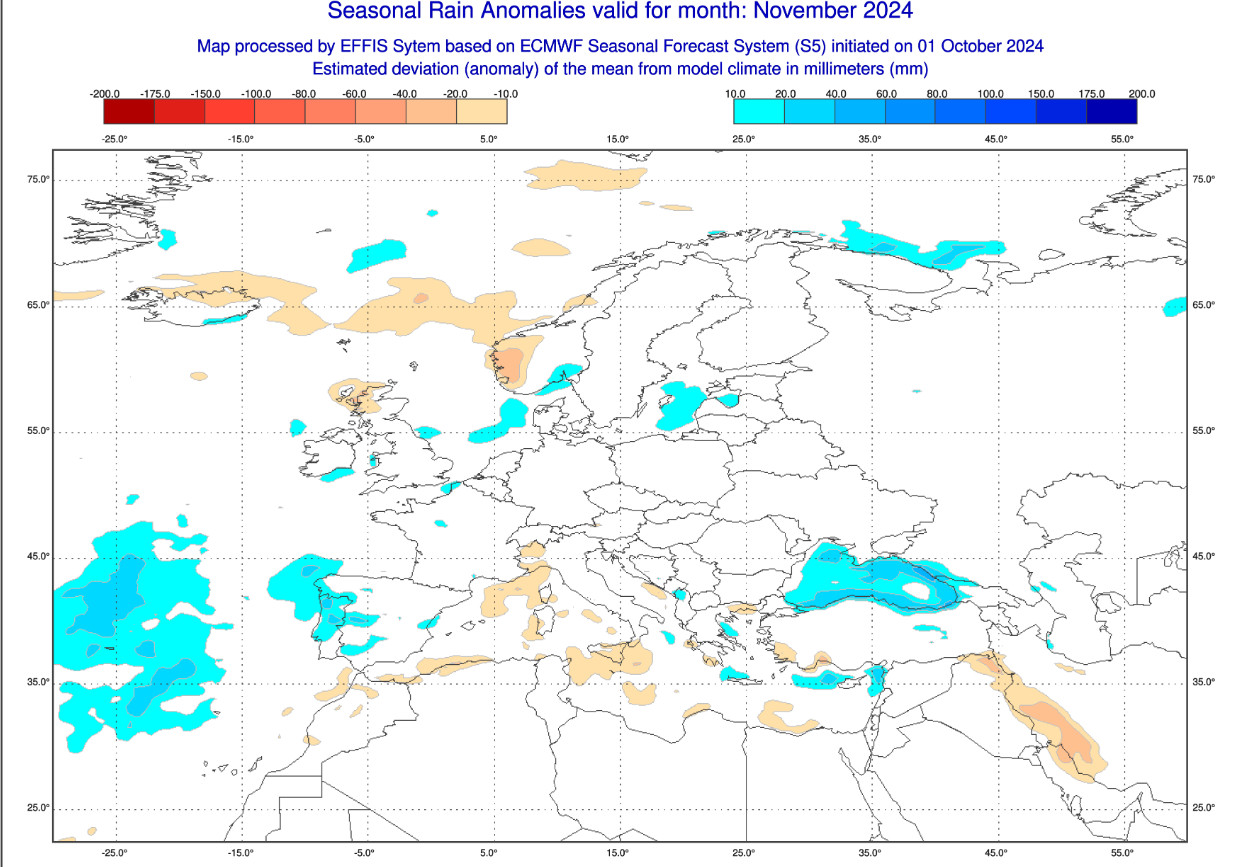 Come si comporteranno novembre e dicembre dal punto di vista pluviometrico in Italia? Lo abbiamo chiesto al prestigioso centro di calcolo ECMWF che periodicamente elabora queste tendenze a lunghissimo termine. La prima cartina mostra le anomalie pluviometriche attese in Europa nell’arco di tutto il mese di NOVEMBRE: