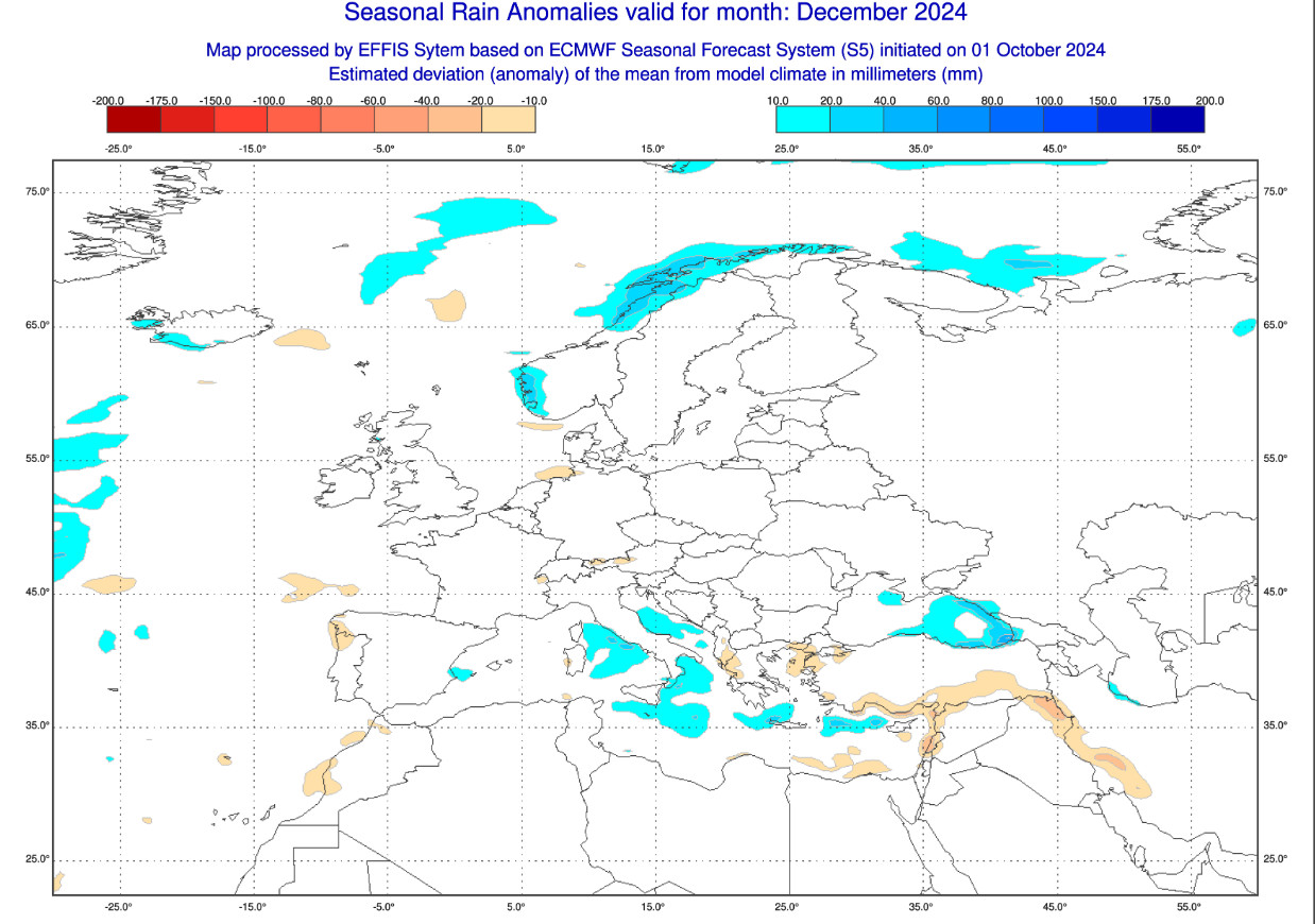 Queste invece sono le anomalie pluviometriche attese in Europa nel mese di DICEMBRE