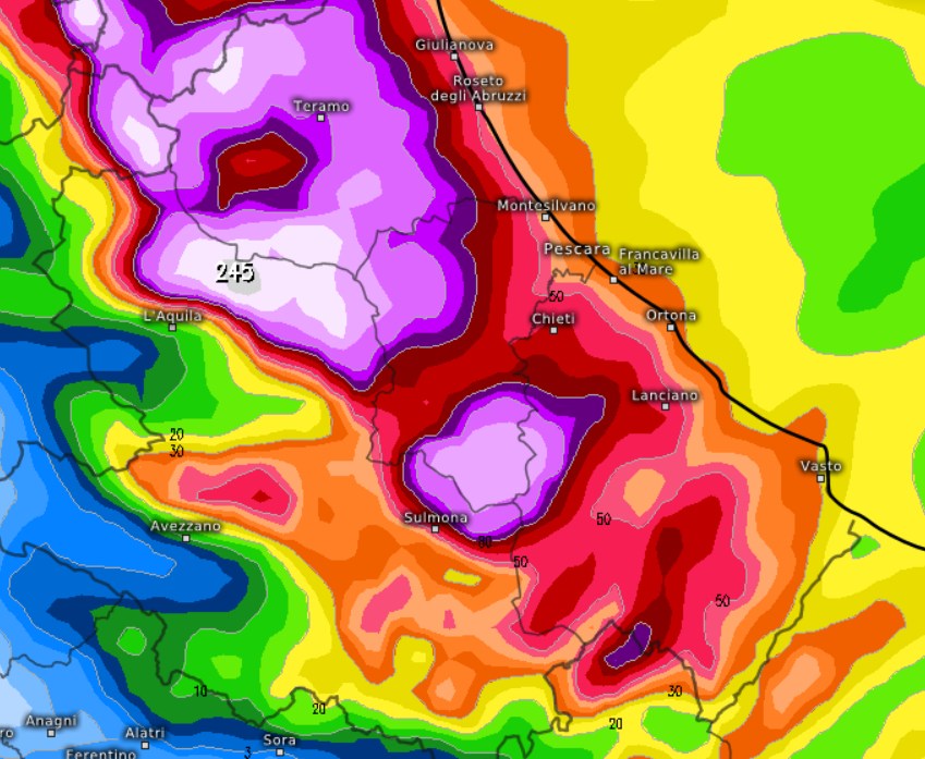 Come si può notare, si prevedono fino a 245mm di pioggia in 24 ore fra le province di Chieti, L’Aquila, Teramo e Ascoli Piceno: si tratta di quantitativi allarmanti che potrebbero provocare allagamenti e criticità anche importanti sulle aree a rischio idrogeologico. Forti nevicate cadranno oltre i 1.500/1.700m di quota, con accumuli di neve che potrebbero superare il metro di altezza oltre i 2.000-2.200m, anche se in aree molto ristrette.