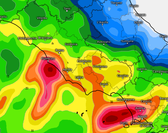 Il temporale laziale si innescherebbe da Fiumicino e Ostia per poi dilagare senza perdere troppa potenza verso la Capitale, scaricando dai 30 ai 50mm di pioggia in poche ore.