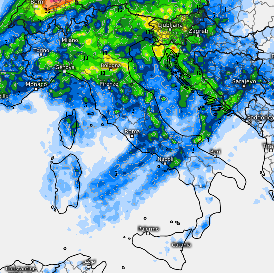 I fenomeni potranno interessare in parte anche le regioni centrali, specie all’interno, e il medio Adriatico, assumendo anche qui prevalente carattere di rovescio o temporale.