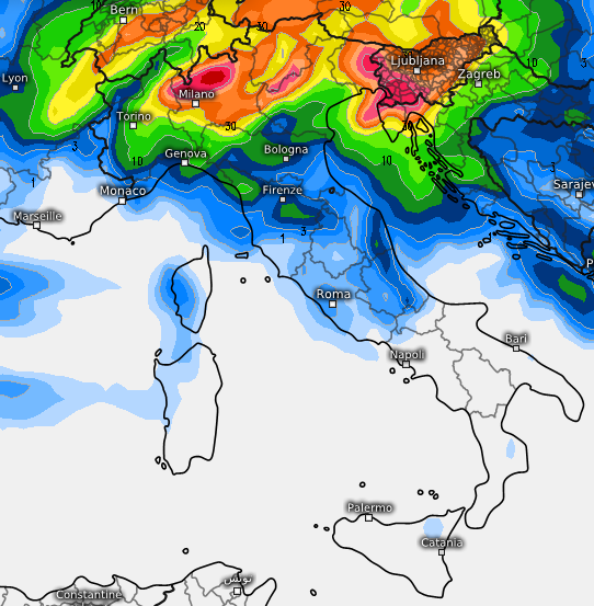 Questa la versione del modello americano, più propenso a distribuire i fenomeni soprattutto tra Lombardia, Piemonte orientale, alto Veneto, basso Trentino e Friuli Venezia Giulia: