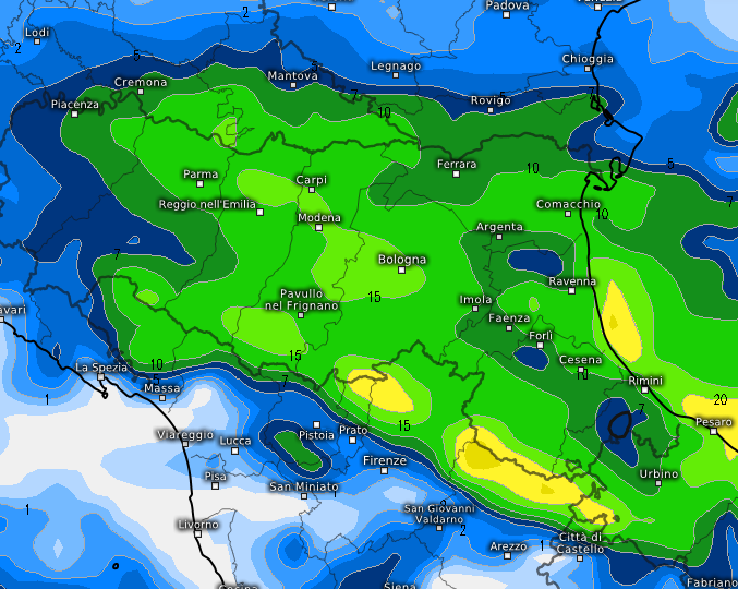 Più in generale, anche se non tutti i modelli concordano, l’accumulo di pioggia previsto tra l’Emilia orientale e la Romagna per effetto della convergenza tra Scirocco e Bora a ridosso del rilievo emiliano (conseguente stau orografico e sviluppo di precipitazioni stazionarie):