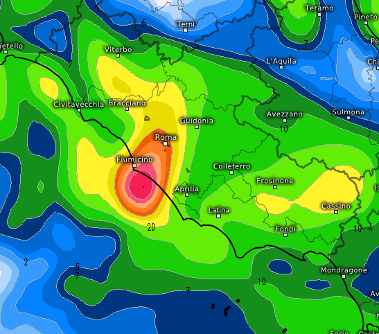 La seconda area critica il modello la individua tra Ostia, Fiumicino e Roma all’alba di giovedì 19 settembre, quando è previsto lo sviluppo di un nubifragio tra la costa e la città con accumuli di pioggia molto rilevanti: