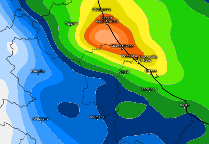 Al momento il modello prevede tre aree in cui potrebbero originarsi delle criticità: la prima è sull’Abruzzo, tra il tardo pomeriggio e la serata di martedì 17, quando si prevede lo sviluppo di un nubifragio sulla costa e nell’immediato entroterra tra il Teramano e il Pescarese, in particolare tra Roseto degli Abruzzi e Pescara: