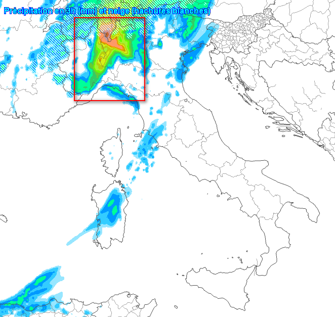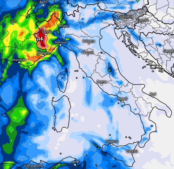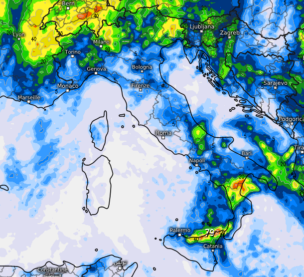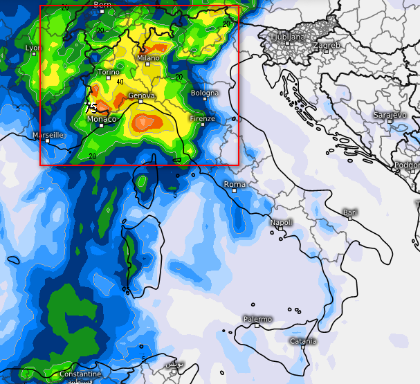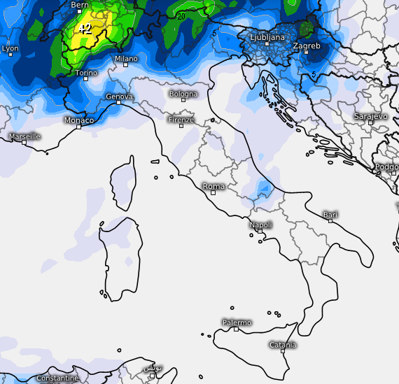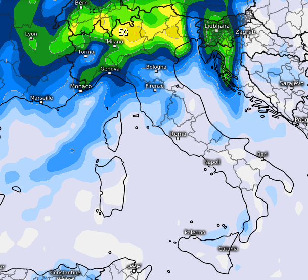 Molto ridimensionato invece il maltempo per il modello americano, che vedrebbe coinvolto essenzialmente il nord delle Alpi:
