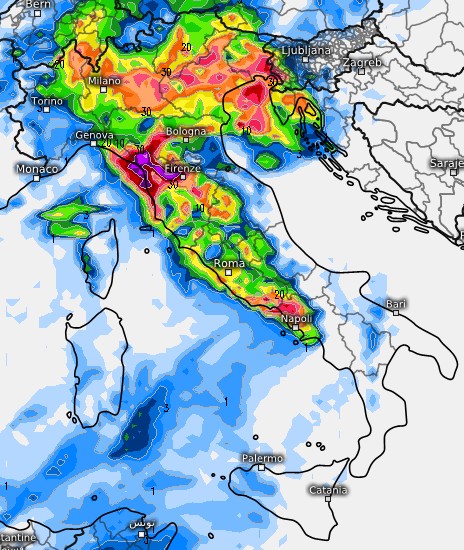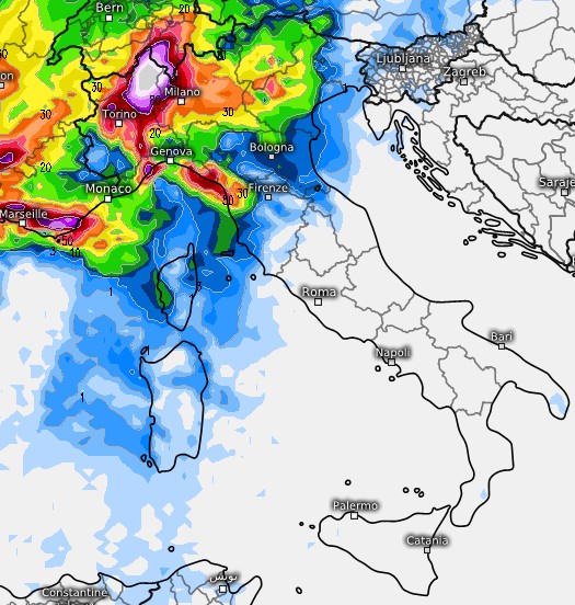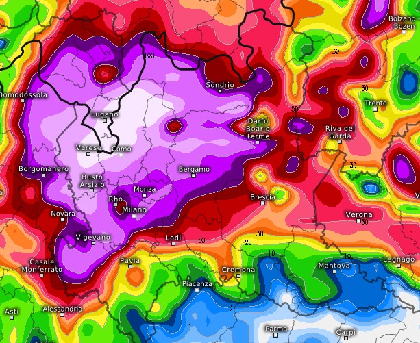 I fenomeni si sposteranno verso l’alta Lombardia, interessando anche Milano, dove si prevedono oltre 100mm di pioggia in sole 24 ore.