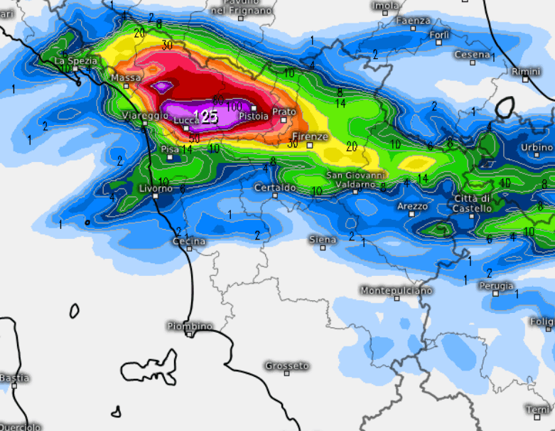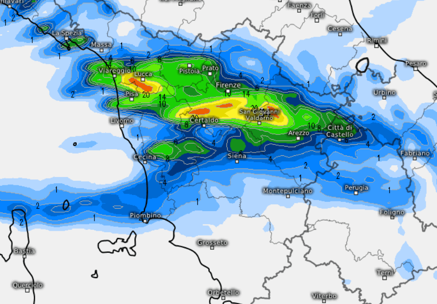 Sono attesi temporali anche di intensità notevole, con rischio di allagamenti soprattutto nell’area compresa tra Lucca e Pistoia. Piogge di un certo peso anche verso Prato e Firenze, non che sulla Versilia ed in parte nella zona di Massa Carrara. Più sporadici o assenti le piogge dal Livornese verso sud.