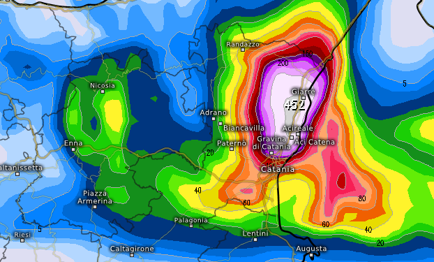 Ed ecco il modello MRF che probabilmente esagera ma che, se trovasse riscontro nella realtà, pone interrogativi inquietanti sulle conseguenze di un impatto di 452mm in sole 48 ore sul territorio compreso tra Gravina di Catania, Acireale, Giarre, l’Etna e Messina: