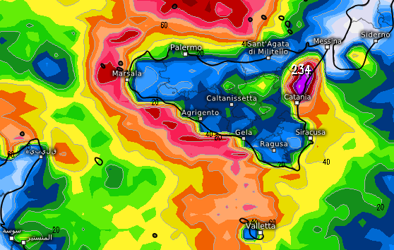 Le aree più colpite dai nubifragi e dai temporali risulterebbero quelle della Sicilia orientale, con ben 234mm di accumulo previsti tra Giarre e Catania, come si vede dalla mappa del modello UKMO: