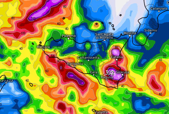 Ancora più pesante la prognosi del modello SWISS, che riassume la pioggia prevista in 48 ore, si stimano ben 302mm tra Siracusano e Ragusano: