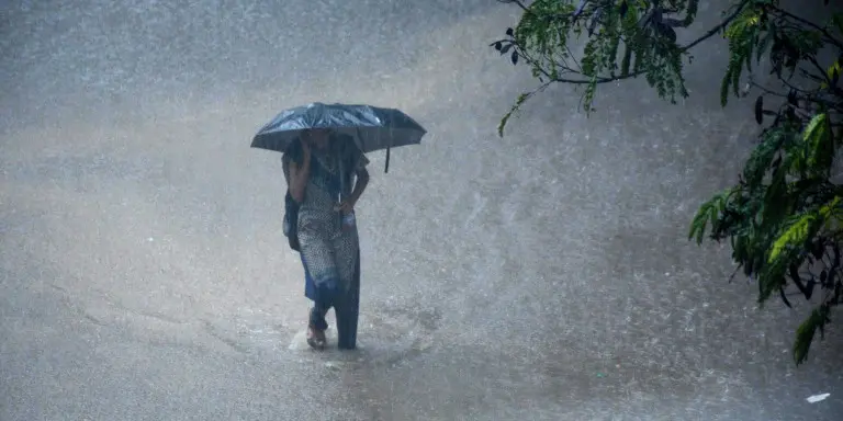 A young Indian woman walks under an umbrella through floodwaters in Chennai on December 1, 2015, during a downpour of heavy rain in the southern Indian city. Heavy rains pounded several parts of the southern Indian state of Tamil Nadu and inundating most areas of Chennai, severely disrupting flights, train and bus services and forcing the postponment of half-yearly school exams. AFP PHOTO/STR / AFP / STRDEL (Photo credit should read STRDEL/AFP/Getty Images)
