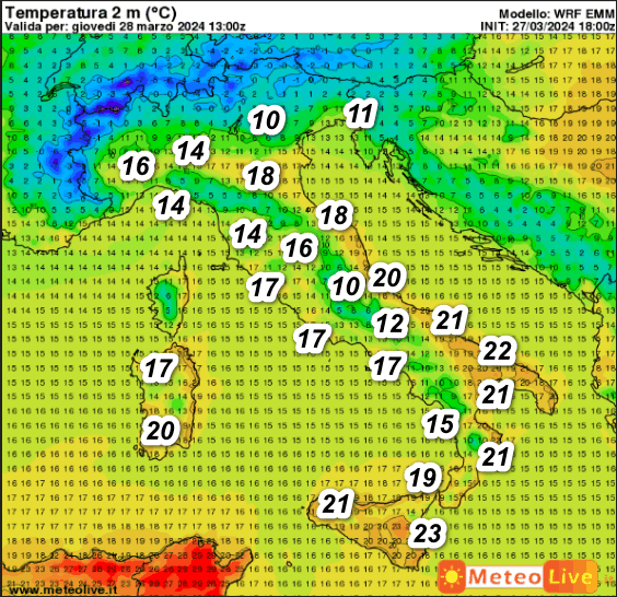 Da segnalare 23° sulla Sicilia orientale e 21-22° su diverse aree del meridione peninsulare, 20° sulla Sardegna meridionale.
