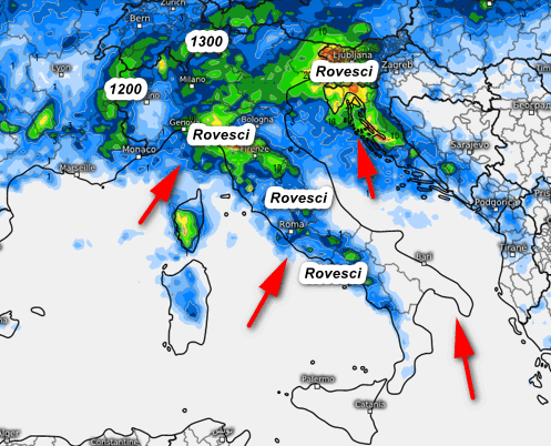 Rovesci sulla Liguria centro-orientale, il nord-est, il versante tirrenico fino alla Campania e le aree interne dell’Italia centrale. Neve sulle Alpi oltre i 1200-1300 metri. Sul resto d’Italia tempo asciutto a parte qualche acquazzone nelle aree interne della Sardegna. Attenzione ai forti venti di Libeccio che ingrosseranno non poco i nostri mari. Mareggiate saranno possibili sui litorali liguri, toscani, sul basso Lazio, la Calabria Tirrenica e la Sardegna occidentale.