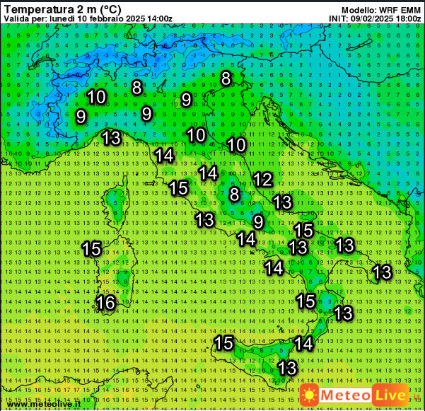 Sul fronte delle temperature, questi sono i valori attesi in Italia alle ore 15 di lunedi 10 febbraio: