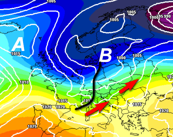 La prima mappa mostra la situazione sinottica attesa in Europa nelle ore centrali di giovedi 9 gennaio: