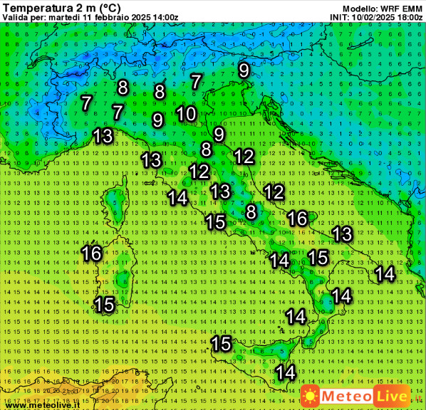 Vediamo adesso il quadro delle temperature previste in Italia alle ore 15 di martedi 11 febbraio: