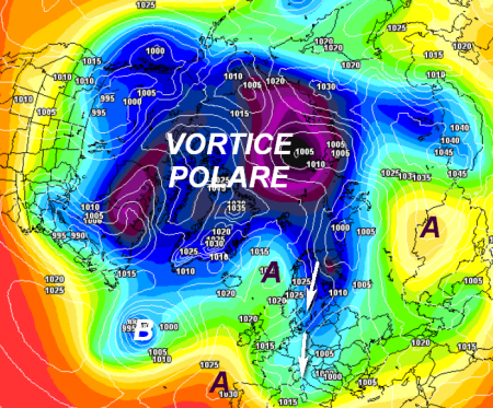 Il vortice polare è ancora relativamente compatto e carico di aria fredda, nonostante qualche lingua si protenda verso sud grazie al disturbo operato da un paio di pulsazioni di aria mite dirette verso il Polo. Lo vediamo in questa mappa nord emisferica per domenica 2 aprile: