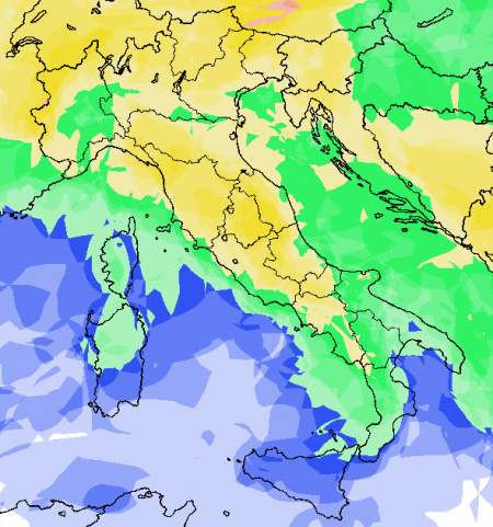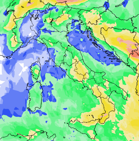 Infatti la mappa relativa alla probabilità di pioggia in percentuale espressa attraverso una scala di colori che abbiamo imparato a conoscere, mette proprio in mostra per domenica 2 aprile una distribuzione di fenomeni molto probabile sulle aree già citate e molto bassa sul nord-ovest: