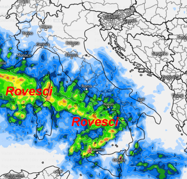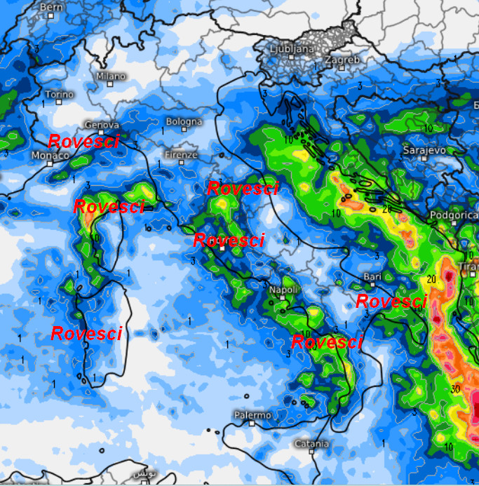 La perturbazione farà passi avanti, ma si sparpaglierà in mille rivoli. Rovesci a macchia di leopardo saranno presenti dalla Liguria verso il centro-sud, con maggiore interessamento del versante tirrenico e delle aree interne. Qualche nevicata oltre 900 metri si farà vedere sull’Appennino Ligure, oltre i 1300-1400 metri sull’Appennino centrale. Piovaschi anche sulla Sardegna occidentale e forse qualche temporale tra la Campania, la Calabria Tirrenica e il Salento, per il resto il tempo resterà asciutto.