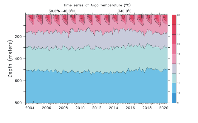 Dai profili verticali di quasi tutti i rilevatori è evidente che la temperatura è abbastanza variabile, a seconda della latitudine, delle correnti marine di superficie e della vicinanza alla costa, nei primi 100-150m di profondità. Alle medie e alte latitudini si può apprezzare anche una certa variazione stagionale, più intensa dove a questa si somma l’apporto di correnti marine profonde, o viceversa di importanti apporti di acqua dolci dalle zone interne.