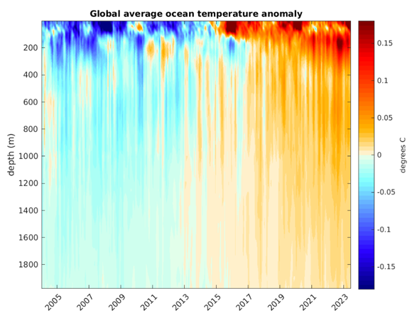 Il recente riscaldamento degli oceani, anche in profondità, che seguono un periodo di relativo raffreddamento. Da notare il totale disallineamento con le temperature globali e il contributo relativamente minimo al fenomeno sotto la profondità dei 400-500m.