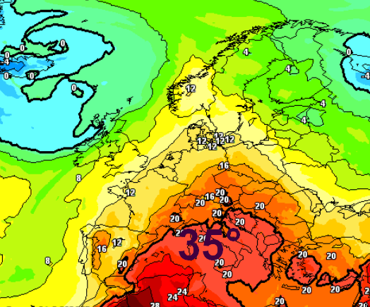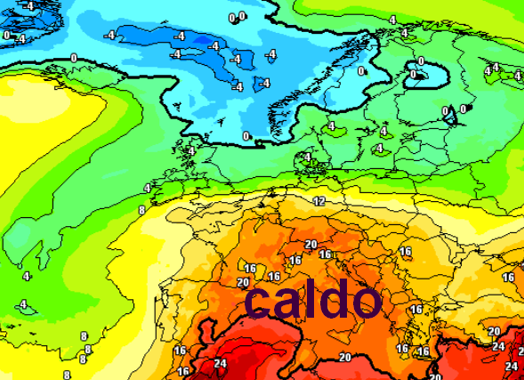 La bolla calda sarà esaltata dall’affondo sull’estremo ovest di una saccatura, in grado dei veicolare aria di matrice nord-africana all’interno della bolla, ecco allora le temperature previste a 1500m per sabato 8 giugno:
