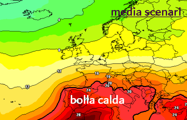 Questo passaggio, sebbene ancora incerto, potrebbe abbassare di qualche grado le temperature al settentrione, localizzando il caldo al centro e al sud. La media degli scenari a livello termico a 1500m prevede infatti proprio per quella data valori già molto più bassi al nord, rispetto alla rovente emissione ufficiale:
