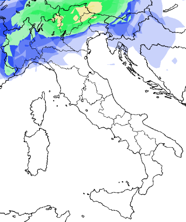 La carta delle probabilità di fenomeni per quella data tratta da una media di tutti gli scenari del modello GFS ci dice che potrebbe piovere anche sul nord Italia, principalmente lungo le Alpi e a nord del Po (colorazione azzurra e verde):
