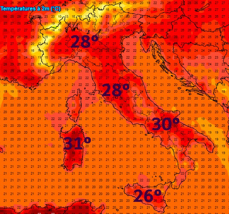 I modelli non riescono a stimare bene i valori che si registreranno nelle isole di calore cittadine, ma è facile che essi superino quelli attesi di almeno un paio di 2°C, facendo segnare anche qui picchi di 30-31°C.