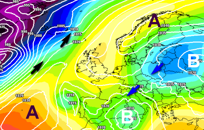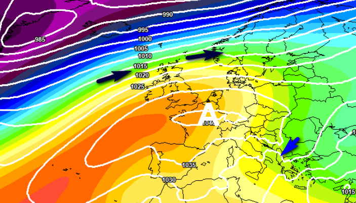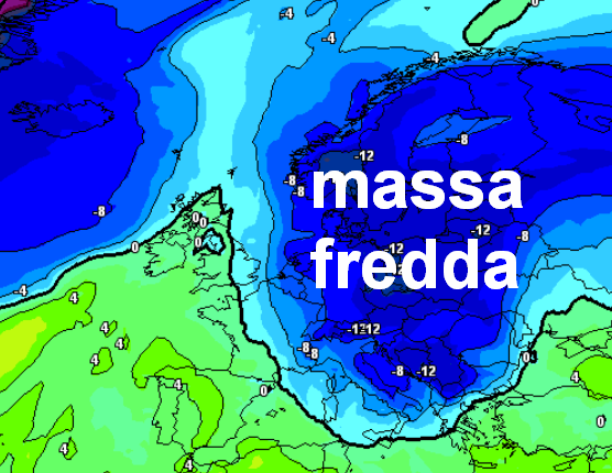 Si nota il vortice a ridosso delle Isole Maggiori, la presenza di un anticiclone sulla Scandinavia che si opporrebbe almeno temporaneamente all’ingresso di aria mite dall’Atlantico e una massa d’aria gelida sulle nazioni dell’estremo est europeo, in grado di interagire con il vortice mediterraneo.