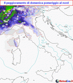 IMPULSO TEMPORALESCO: domenica giungerà dalla Francia un impulso temporalesco accompagnato da aria meno calda, che andrà a colpire il settentrione nel pomeriggio, determinando fenomeni anche di forte intensità dapprima sul settore occidentale, poi tra Lombardia e Triveneto.