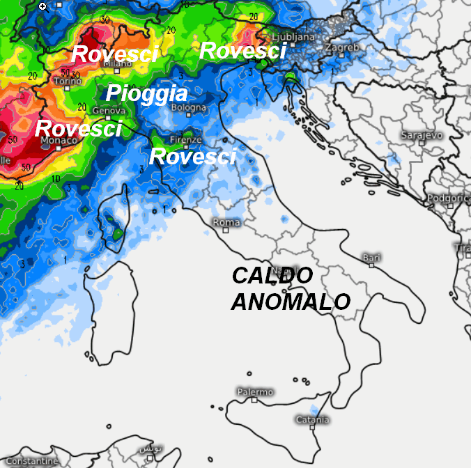 Piogge e rovesci praticamente su tutto il centro-nord, ma in misura maggiore al nord-est e nelle aree interne dell’Italia centrale. Un miglioramento andrà invece in scena al nord-ovest tra la tarda mattinata e il pomeriggio. Le precipitazioni arriveranno in serata fino alla Campania, mentre il restante meridione seguiterà ad avere caldo anomalo.