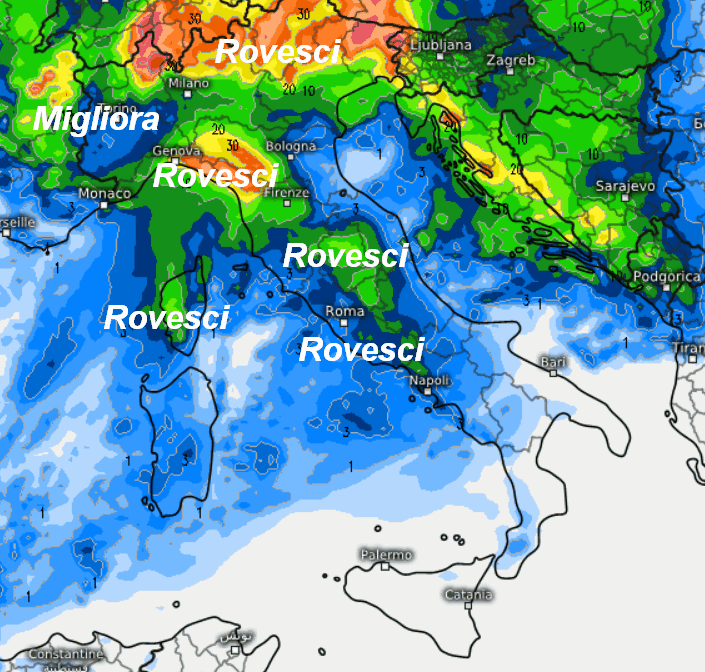 Al nord si farà sotto una vasta ed intensa perturbazione che determinerà tempo nel complesso perturbato con piogge e rovesci sparsi. La neve riguarderà solo i settori alpini, ma a quote elevate. Fenomeni particolarmente intensi sono attesi tra bassa Val d’Aosta, alto Piemonte, alta Lombardia e Liguria centro-occidentale; fenomeni invece meno probabili sull’Emilia Romagna. Tra il tardo pomeriggio e la serata qualche rovescio si spingerà anche sull’alto versante tirrenico, in modo particolare sulla Toscana ed i settori interni.