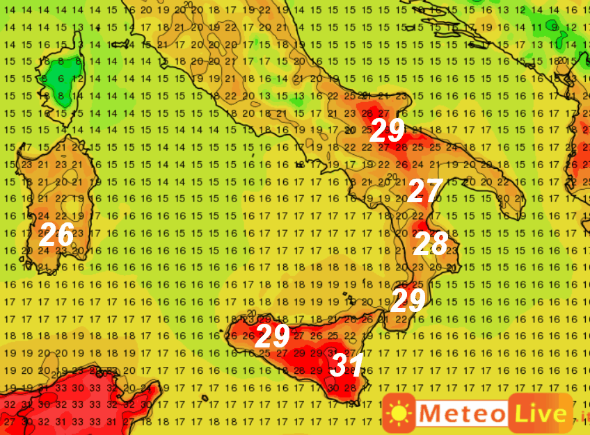 Punte di 31° sono attese sulla Sicilia orientale, 29° sul Tavoliere delle Puglie, 28° in Calabria, 27° sulla Lucania e 26° sulla Sardegna.