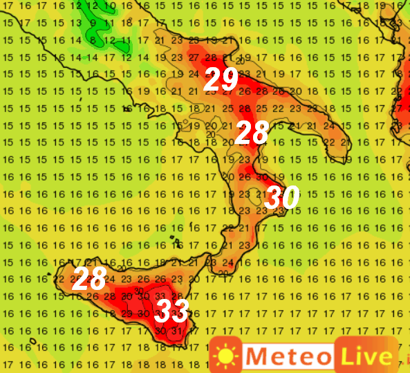 La Sicilia orientale sperimenteranno 33°! 30° sulla Calabria Ionica, 28-29° tra Lucania e Puglia.