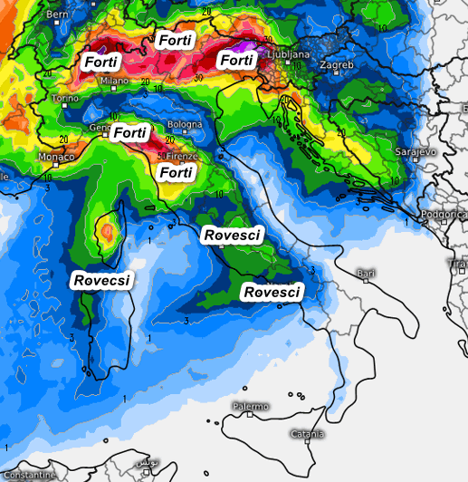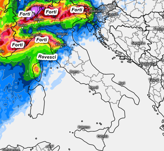 Passiamo ora alle precipitazioni. La prima mappa mostra la sommatoria delle precipitazioni attese in Italia fino alle 8 di domani mattina, Pasquetta: