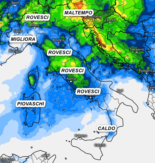 Maltempo al nord-est con rovesci e neve oltre i 1600-1800 metri. Variabilità nell’arco della giornata al nord-ovest con rovesci residui tra alta Lombardia, alto Piemonte ed Appennino Ligure orientale. Forte Libeccio sul Ligure con condizioni meteomarine non buone. Al centro tempo perturbato su Toscana, Umbria, Lazio e zone interne delle Marche con rovesci e qualche temporale; più asciutto il tempo lungo le coste di Marche e Abruzzo; qualche piovasco anche in Sardegna. Al sud ancora caldo anomalo, ma tendenza a qualche rovescio in serata sulla Campania, per il resto cieli ancora lattiginosi per sabbia in sospensione.