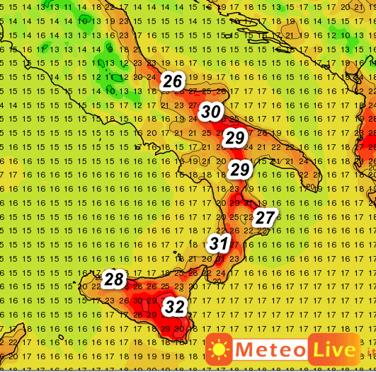 32° sono attesi sulla Sicilia orientale, 31° sulla Calabria e 30° sul Tavoliere delle Puglie; altrove valori diffusamente superiori a 25°.