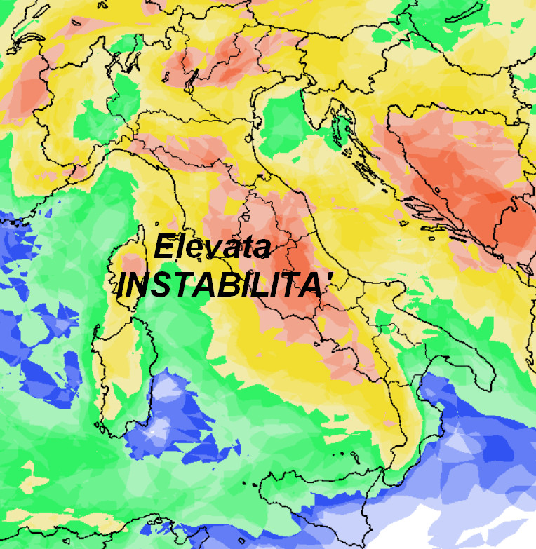 A parte le estreme regioni meridionali e forse il sud della Sardegna dove la probabilità di pioggia sarà BASSA, sul resto d’Italia la medesima probabilità sarà ELEVATA o localmente MOLTO ELEVATA dove vedete il colore tendente al rosso sulla cartina, a testimoniare una situazione ancora dominata da un’elevata instabilità atmosferica.