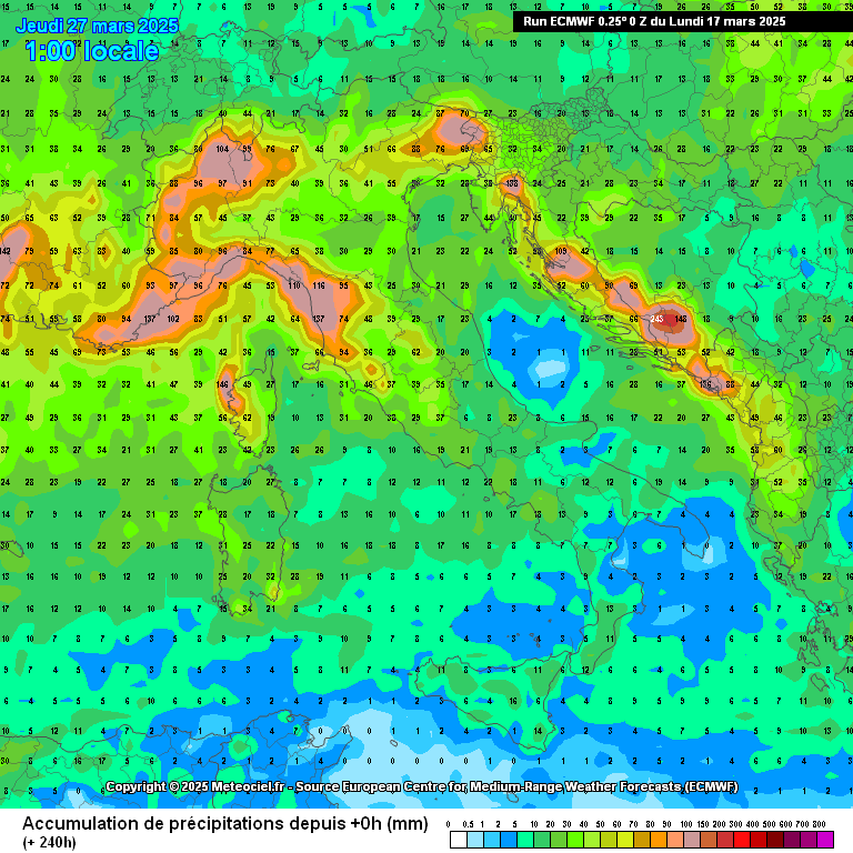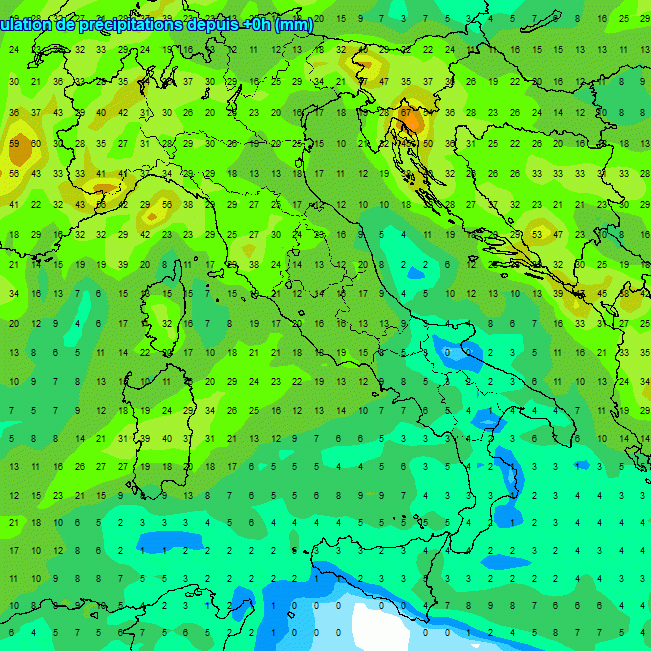 Notiamo su questo elaborato piogge abbondanti su alta Toscana, Liguria, alto Piemonte, alta Lombardia, Alpi occidentali e Friuli Venezia Giulia. Piogge di un certo peso anche tra Umbria e Lazio, mentre al sud e sul medio Adriatico le piogge si prevedono più scarse.