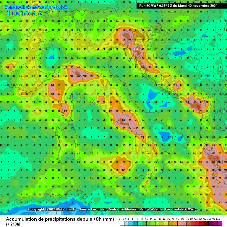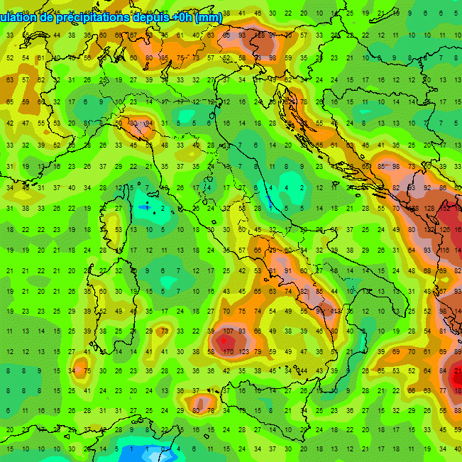 Situazione pioggia simile al modello GFS con i massimi previsti sul Tirreno, nelle aree interne, ma anche al nord specie sulla Lombardia, il nord-est e il Levante Ligure. Un po’ a riparo il versante adriatico ed alcune aree del meridione esposte ad est che potrebbero restare sottovento al flusso occidentale dominante.