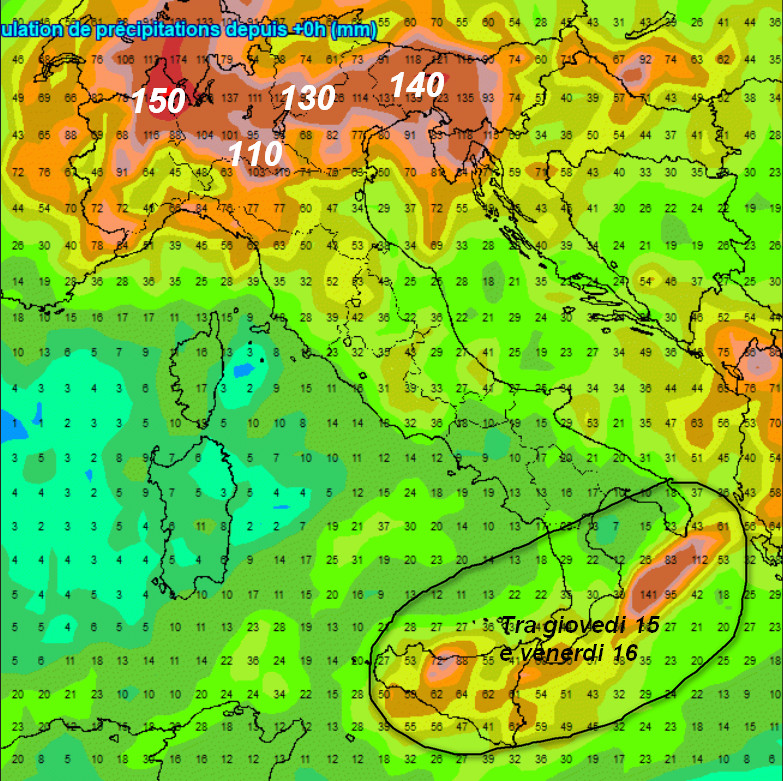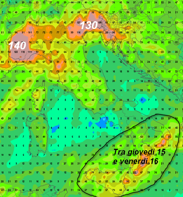 Le piogge anche abbondanti che si notano all’estremo sud cadranno nelle prossime 48 ore e saranno determinate dalla perturbazione afro-mediterranea che sta entrando in scena in queste ore alle basse latitudini italiche. Le piogge presenti al nord cadranno invece nell’arco della settimana prossima, quando sembra instaurarsi un regime di correnti sciroccali con piogge abbondanti sull’alta Italia. In particolare, secondo GFS sono attesi 150mm sull’alto Piemonte, 140mm sul Friuli, 130mm sulle Prealpi Venete e 110mm sulle Prealpi Lombarde.